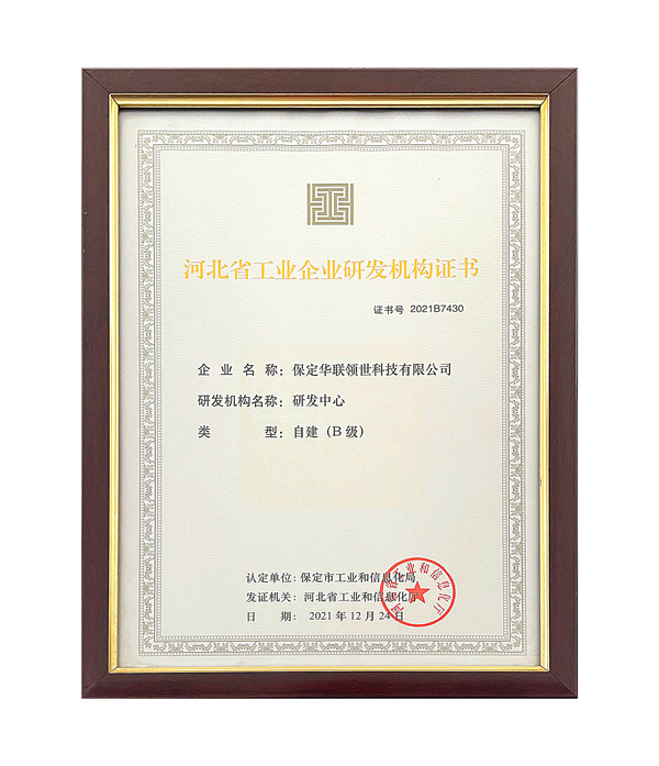 保定華聯(lián)領(lǐng)世科技有限公司(簡(jiǎn)稱“華聯(lián)領(lǐng)世”)榮獲由河北省工業(yè)和信息化廳頒發(fā)的“河北省工業(yè)企業(yè)研發(fā)機(jī)構(gòu)證書(自建B級(jí))。