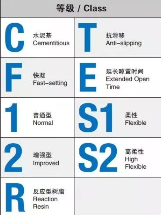 在正規(guī)的瓷磚膠產(chǎn)品包裝或者資料上,您會發(fā)現(xiàn)有標(biāo)上瓷磚膠所符合的等級,如C1,C2,還其他的字母,例如F,R,T,E,S1,S2等。